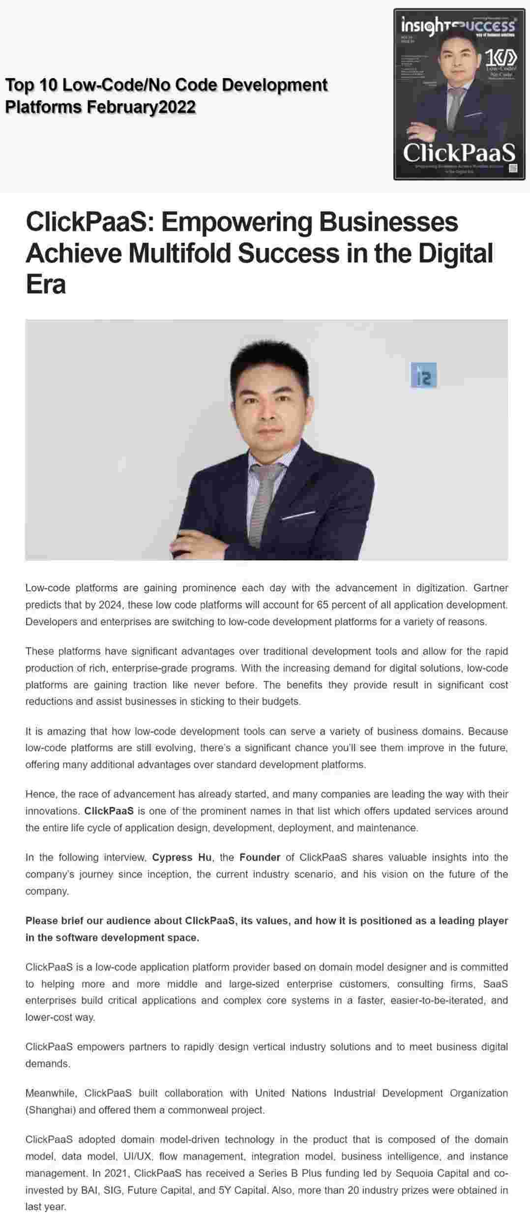 2022年年初,,,,NO钱包入选外媒Insights Success低代码/无代码开发平台 Top10,,,创始人、、、、CEO胡柏受邀接受专访并荣登封面人物,,,他与Insights Success的读者分享了NO钱包成立的初心、、发展历程、、、、当前的行业发展趋势以及他对公司未来的展望。。。。